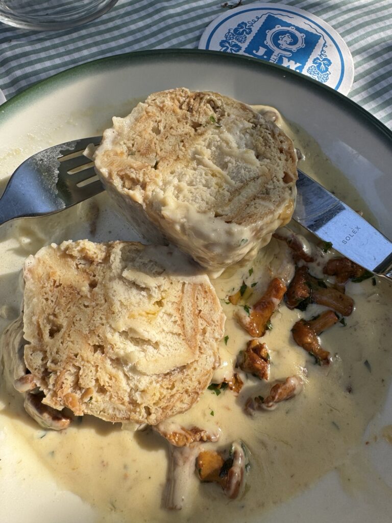 そして今が旬のキノコ「フィファリンゲ(アンズダケ)」のクリーム煮とプレッツェル🥨の入ったお団子のようなもの。