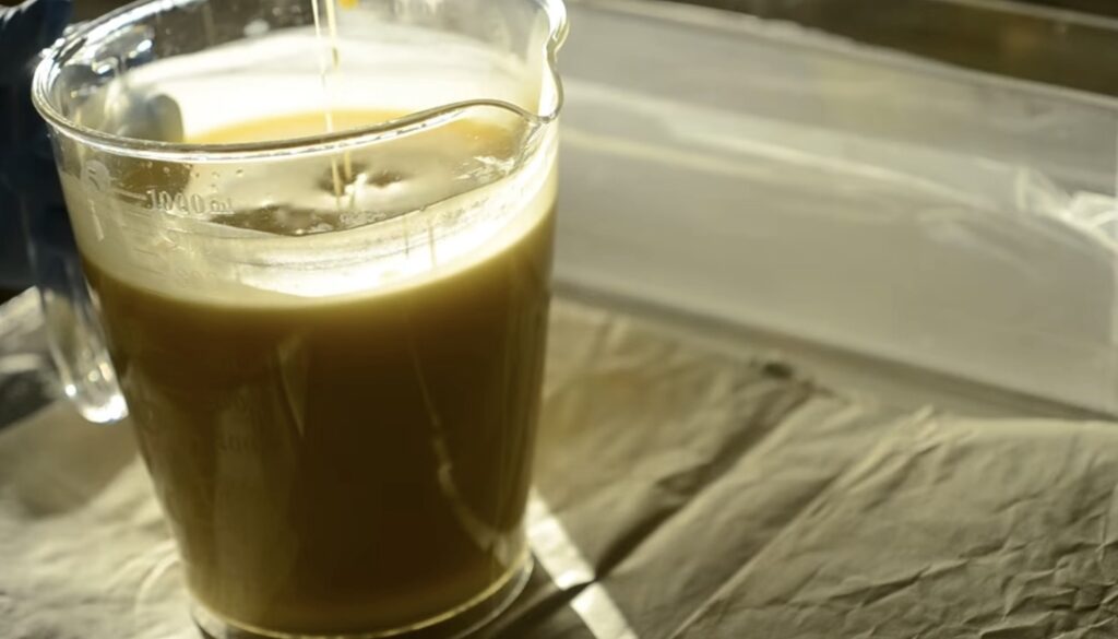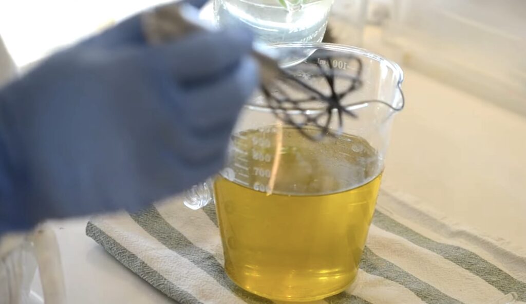 6.温度が合ったら、オイルの中に苛性ソーダ水を入れる。