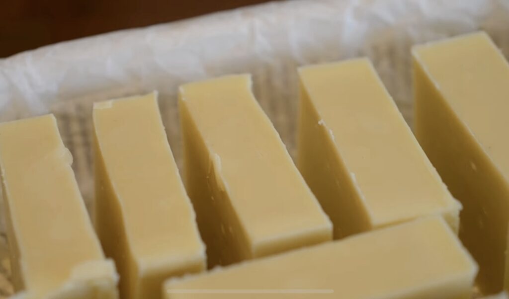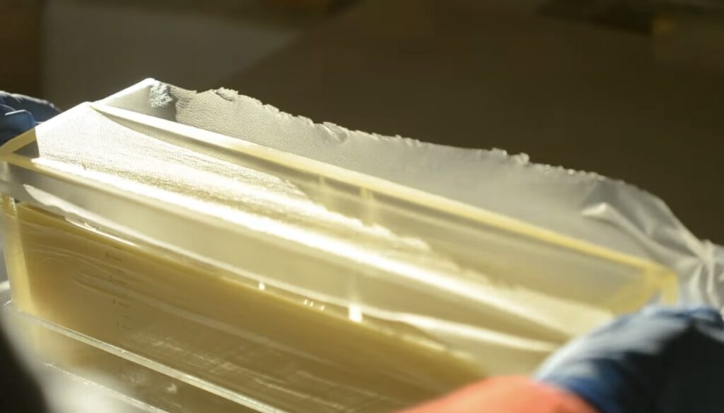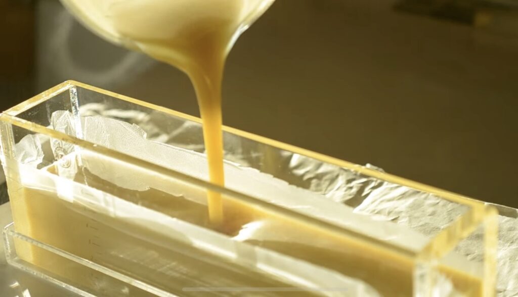 11. 24時間たって固まっていたら、ゴム手袋をして型から取り出して、石けんを切り分ける。