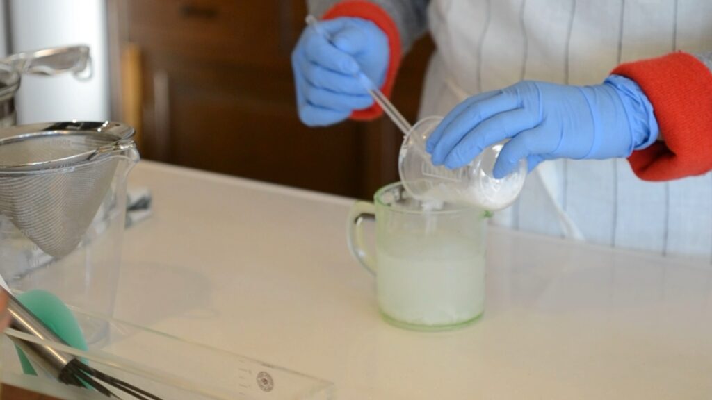 この時の石けんはまだ強アルカリ性ですので、素手で触らないようにしてください。